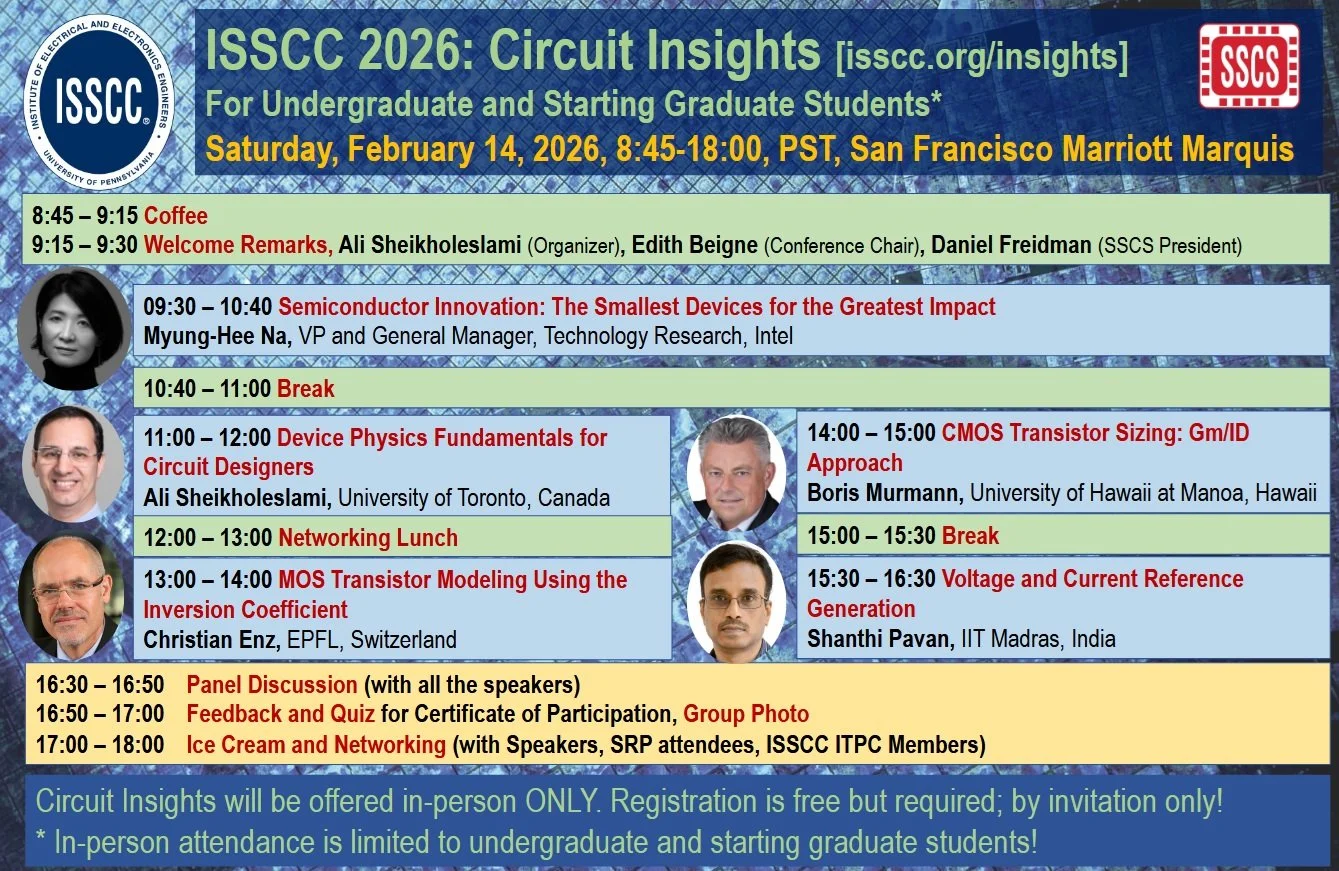 ISSCC 2026 offers the fifth edition of its Circuit Insights on Saturday, Feb. 14, 2026, 8:45am - 6:00pm PST. As in the past four years, this event targets 3rd- and 4th-year undergraduate students and starting graduate students in the field of circuit design, but may also be of interest to new circuit design engineers. The event will be held in person for a small audience of 50 students (by invitation only) at the ISSCC venue at the Marriott Hotel in San Francisco, and will be recorded for later release on the SSCS/ISSCC YouTube channel.
